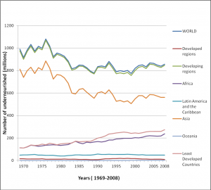 Several UN agencies discussed the issues of food and hunger in the 7-billion-people scenario. Ms Lauren R. Landis, who is the Director the World Food Program (WFP), elaborated her lecture with up-to-date fact and figure of famine and food scarcity around the world. War and natural disasters are major causes of malnourishment in many parts of the world. According to FAO statistics, 925 million people do not have adequate food, and 98 percent of them live in developing countries. In 2006, UNICEF revealed that in developing countries, there were five million children under five years old dying each year due to under-nutrition or malnutrition. According to 4th edition of UN-WWDR in 2012, most alarming are the situations in the Region in Africa, in Least Developed Countries (LDC) and within the whole developing regions, while in total, there is a reduction of undernourished people worldwide (see the Table 1 below).